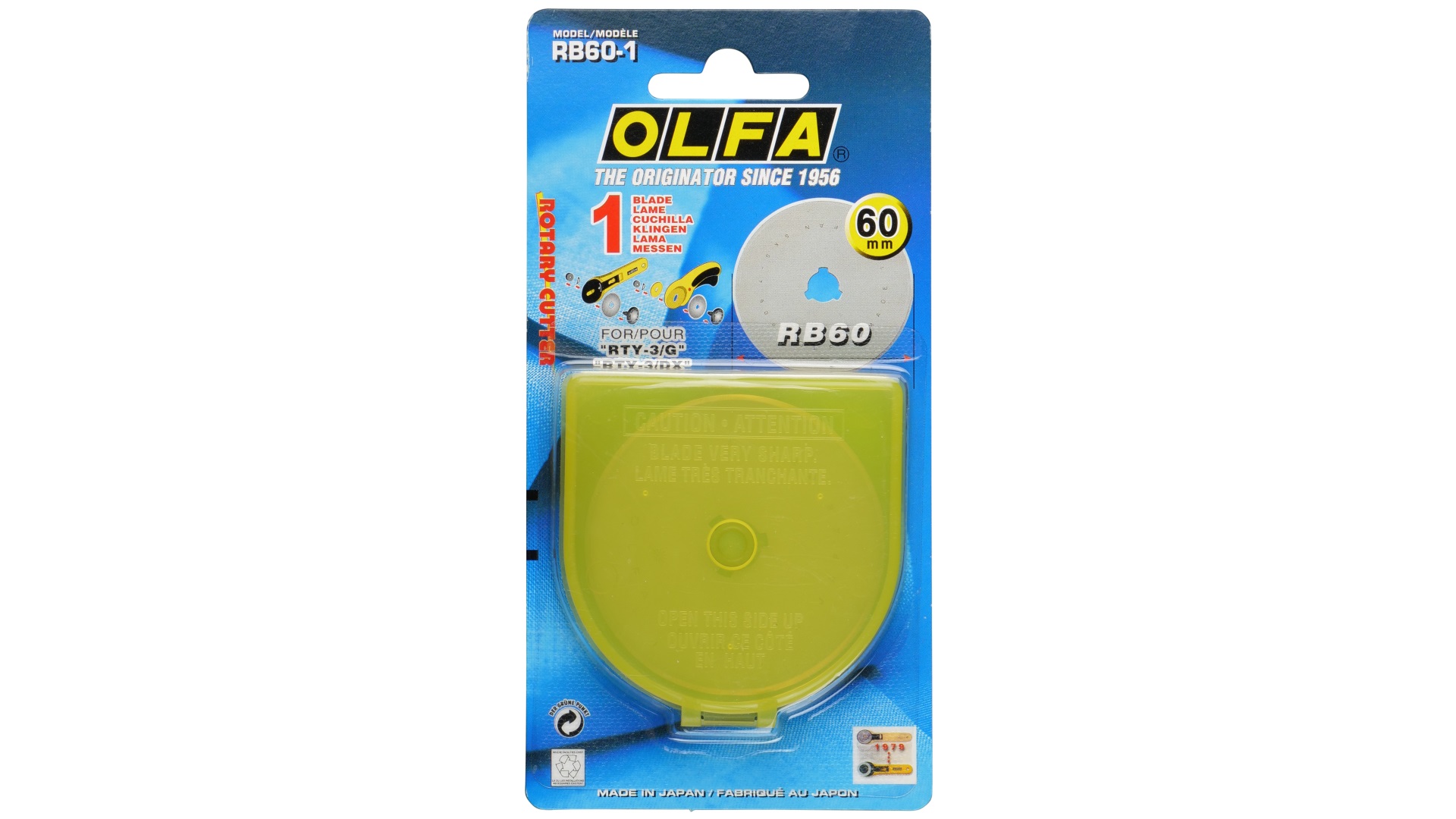Eine Rundklinge, 60mm Durchmesser aus hochwertigem, rostfreiem Kohlenstoff-Werkzeugstahl wird mit OLFAs präziser Multi-Step-Produktion für unvergleichliche Schärfe und Langlebigkeit produziert. Sicherheitshinweis: Diese Klinge ist äußerst scharf! Nur für erfahrene Nutzer empfohlen. Unbedingt außerhalb der Reichweite von Kindern aufbewahren!